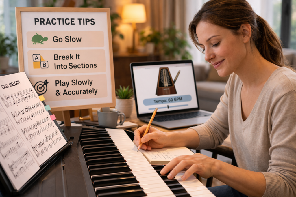 Practicing slowly helps prevent mistakes and reinforces accurate timing.